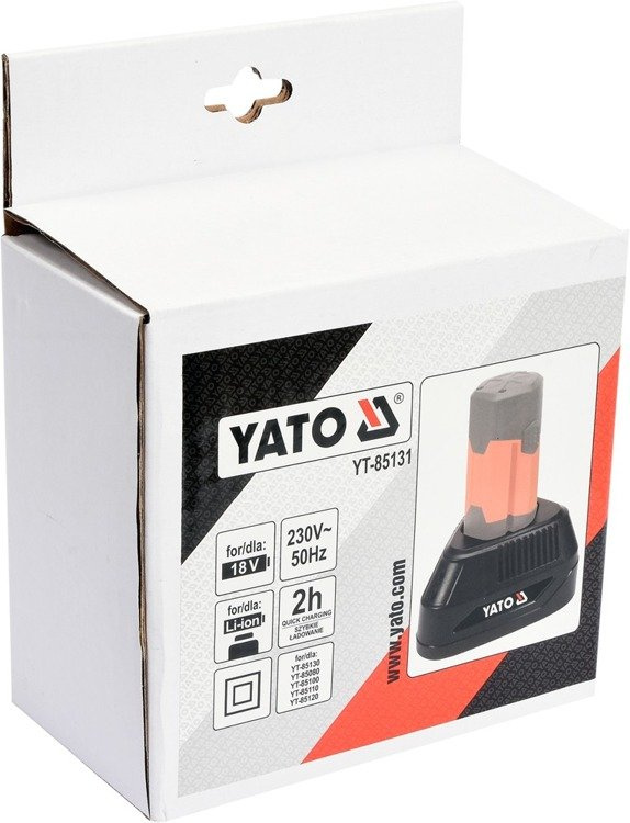 Ładowarka YATO YT-85131 dedykowana do ładowania baterii Li-Ion 18V/3,0Ah YT-85130 używanej do akumulatorowych elektronarzędzi ogrodowych YT-85080, YT-85100, YT-85110, YT-85120.