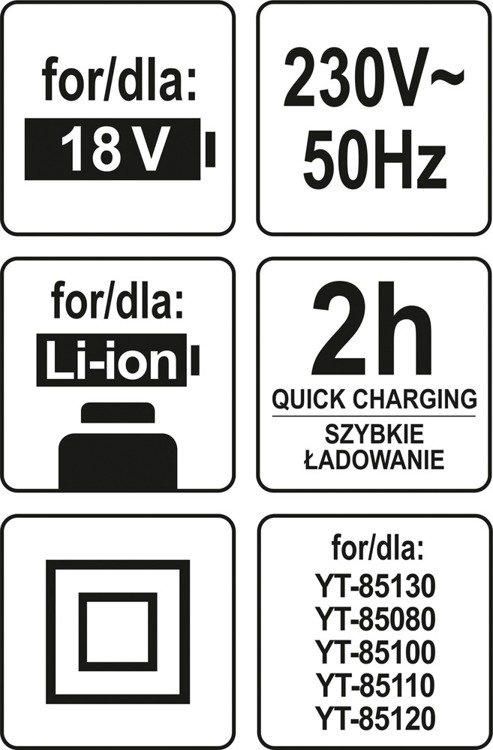 Dedykowana do ładowania baterii Li-Ion 18V/3,0Ah YT-85130 używanej do elektronarzędzi YT-85080, YT-85100, YT-85110, YT-85120.