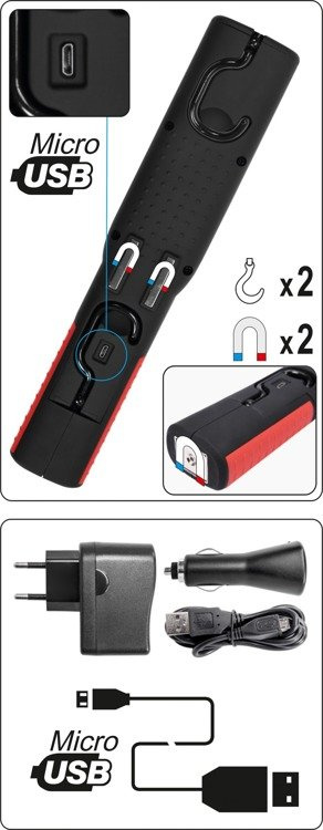 - Lampa posiada uniwersalne gniazdo do ładowania µUSB. Ładowarka posiada odpinany przewód USB, co umożliwia ładowanie lampy z komputera, power banku lub innych urządzeń z gniazdem USB.
