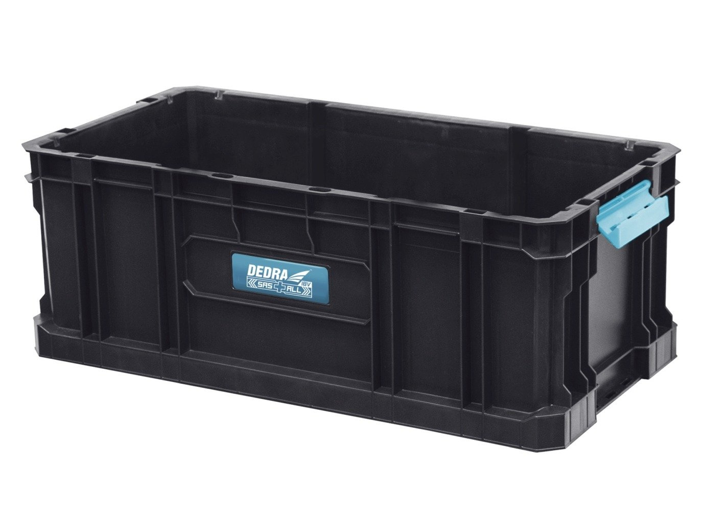 To jedna ze skrzynek modułowych systemu transportowego DEDRA SAS+. Dzięki optymalnie dobranym rozmiarom (wymiary zewnętrzne 530x295x195mm) i pojemności 26l skrzynka spełni wymagania zarówno profesjonalistów jak i domowych majsterkowiczów. Przemyślana konstrukcja ułatwia dopasowanie skrzyni do indywidualnych potrzeb. We wnętrzu skrzyni znajdują się prowadnice do regulowanych przegród, które można wyjąć bądź przełożyć tworząc bardziej pasujący użytkownikowi układ komór. (Przegrody nie są częścią zestawu) Skrzynia wykonana została z wysokogatunkowego tworzywa, dzięki któremu jest wytrzymała, a gęste ożebrowanie skrzyni zapewnia jej dużą sztywność i odporność na odkształcenia. Poliamidowe zaczepy gwarantują solidne i wytrzymałe połączenie z pozostałymi skrzyniami modułowymi.