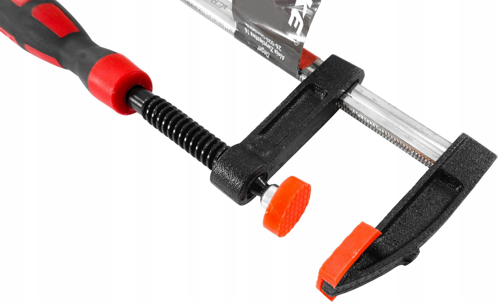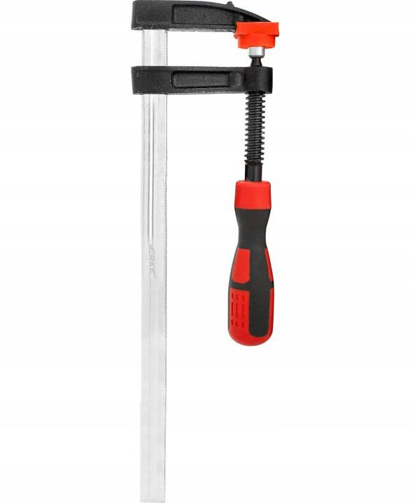 Stabilny, mocny ścisk do prac stolarskich i montażowych typu F. Talerz dociskowy osadzony na przegubie kulowym, łatwo dopasowuje się do powierzchni a miękkie osłony z tworzywa chronią ściskany materiał. Rękojeść osłonięta miękkim technicznym tworzywem pozwala na silne zaciśnięcie materiału.