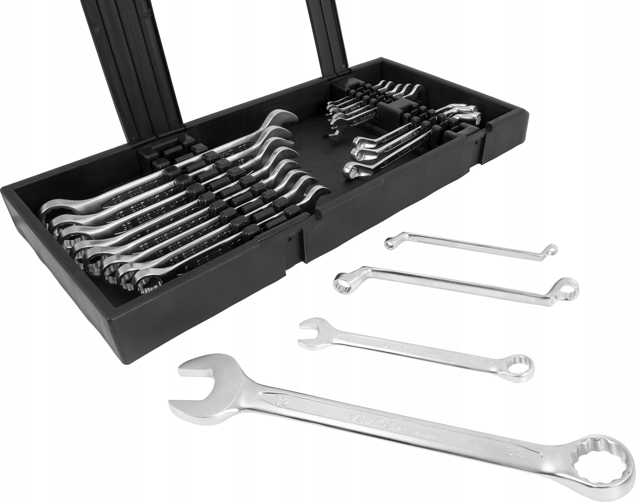 - W zestawie znajdują się najbardziej popularne rozmiary kluczy płasko oczkowych oraz oczkowych wygiętych.