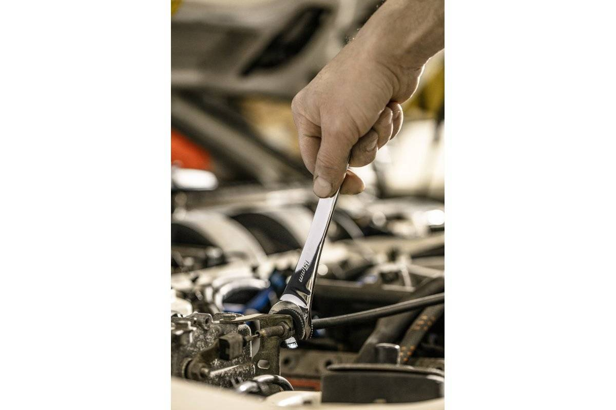 - półotwarta konstrukcja mechanizmu grzechotkowego umożliwia nałożenie klucza na szpilki bez względu na ich długość, podobnie jak końcówkę płaską;