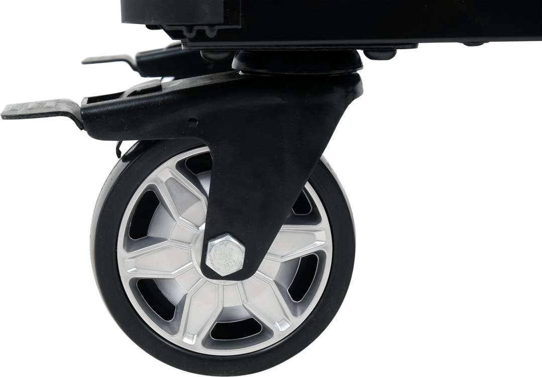 Stabilna konstrukcja spoczywa na czterech kołach, z których dwa są skrętne i wyposażone w hamulce.