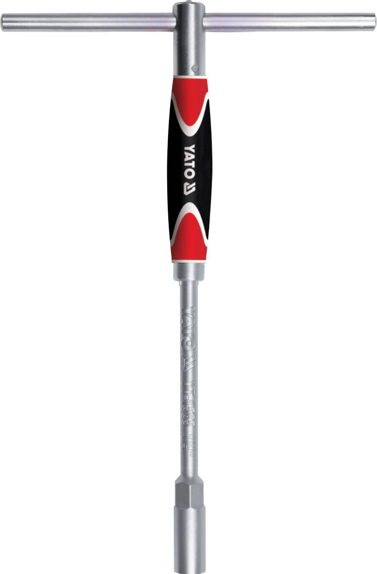 Klucz nasadowy typu „T” wyposażony w ergonomiczną rękojeść oraz przesuwane pokrętło z blokadą położenia.
