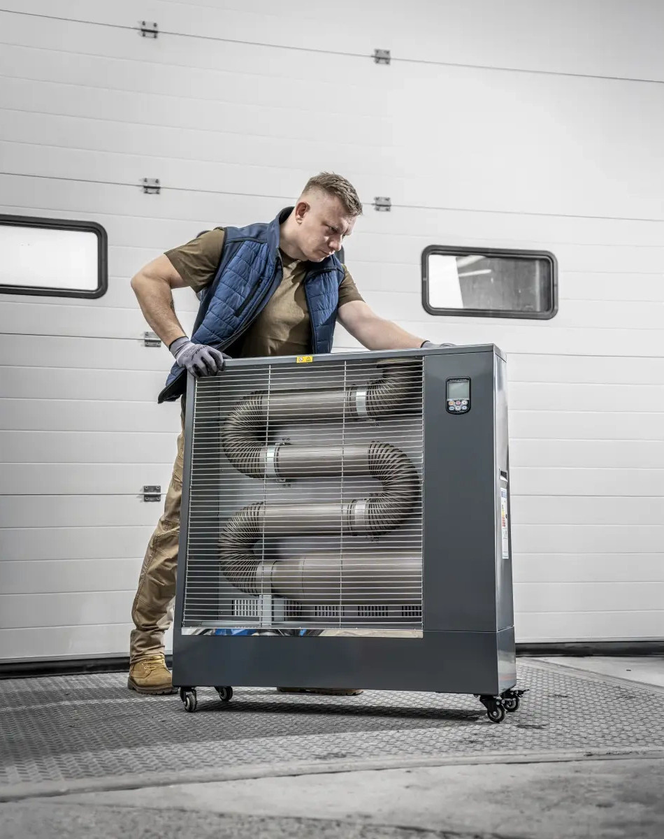 • Płaska, oszczędzająca miejsce konstrukcja – ułatwia przechowywanie nagrzewnicy w przestrzeniach