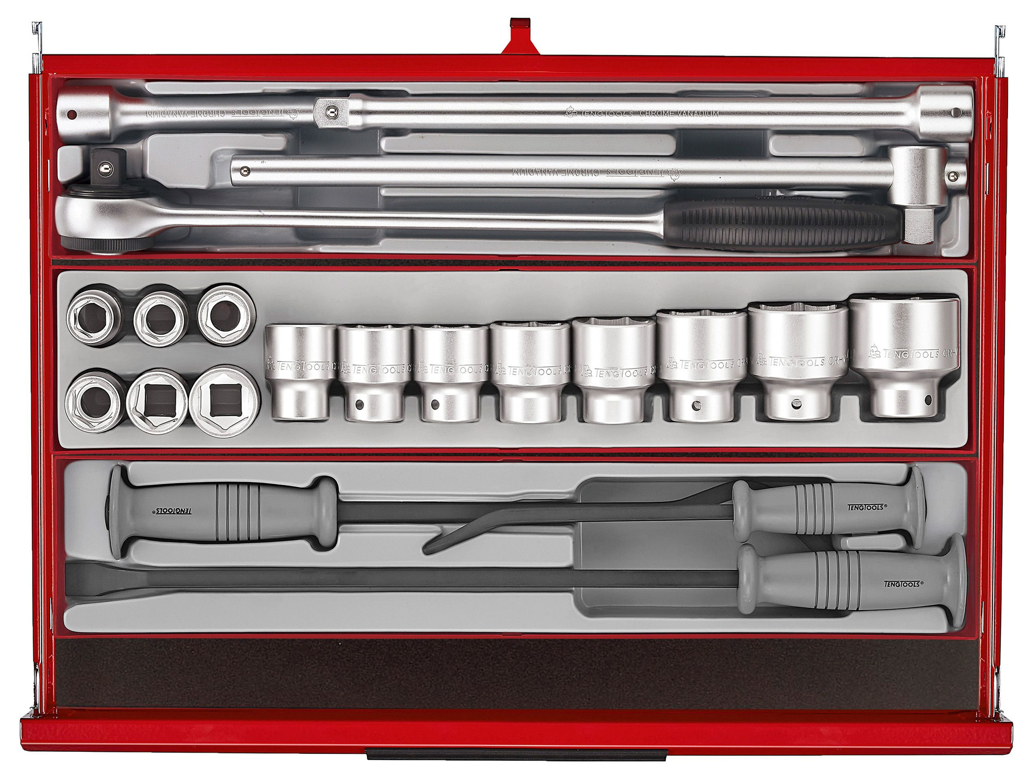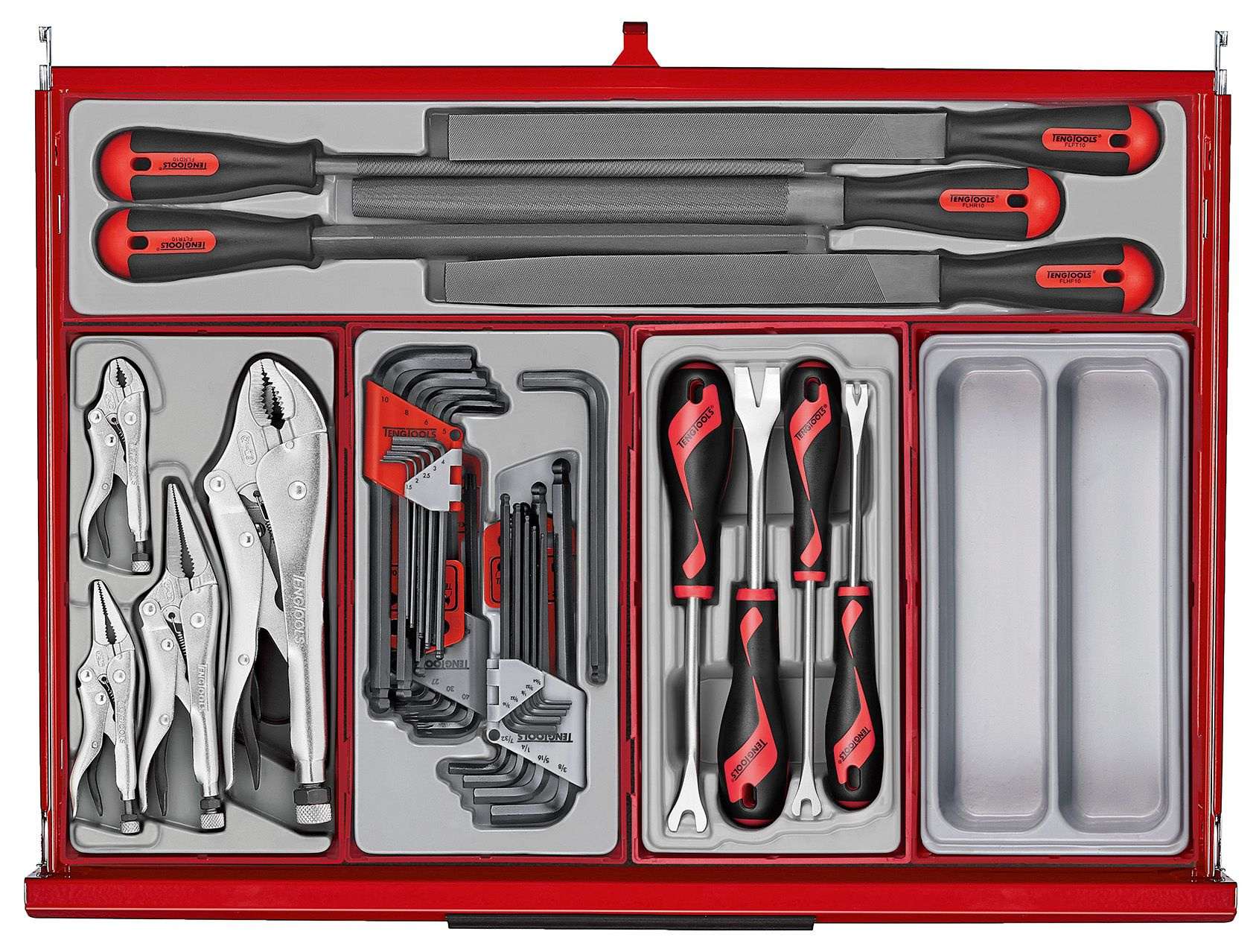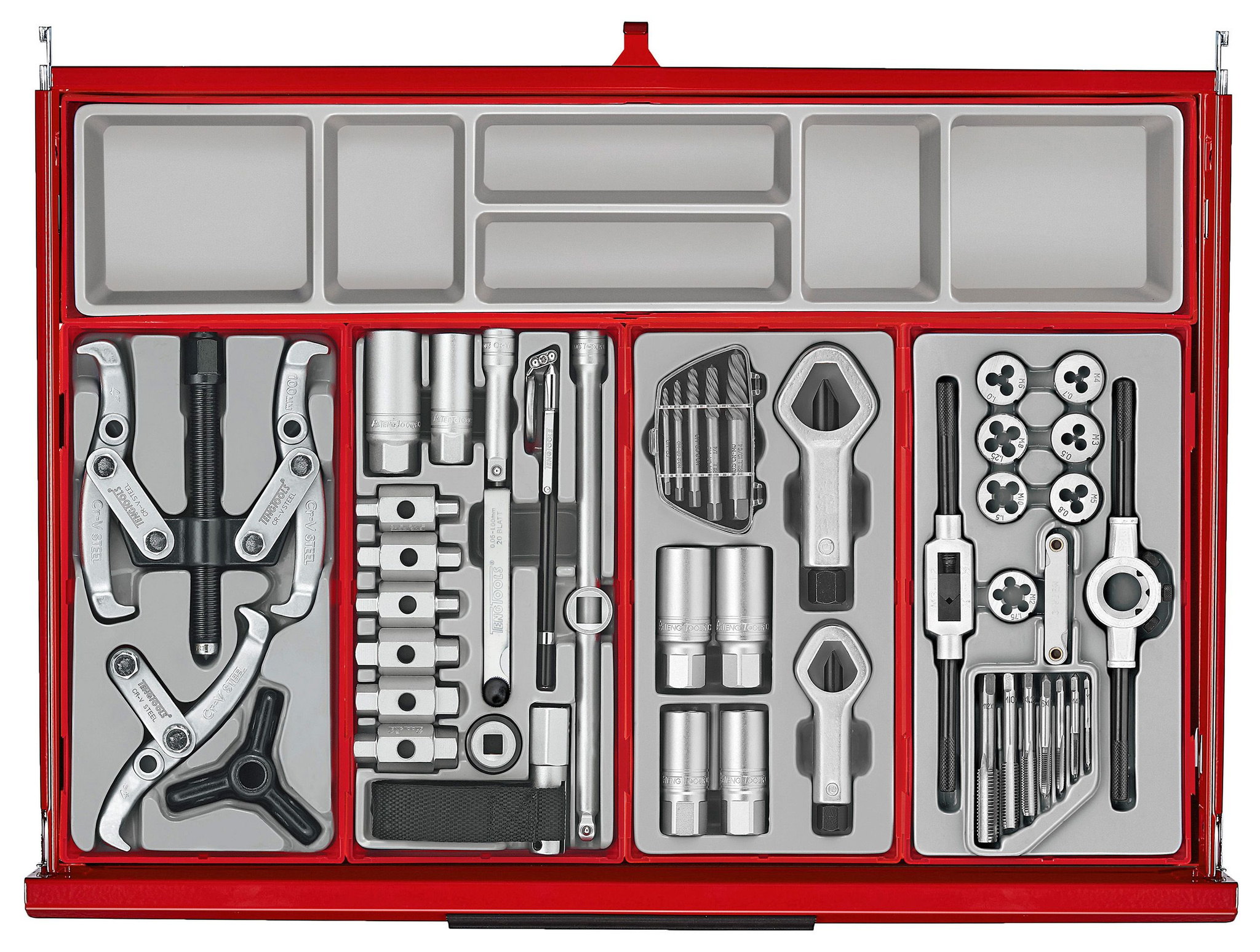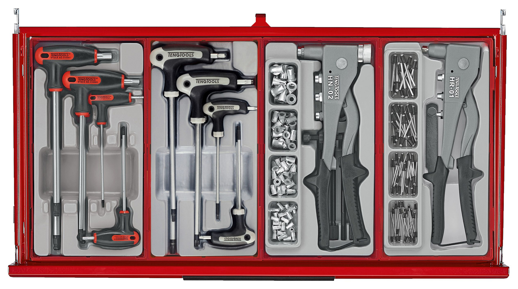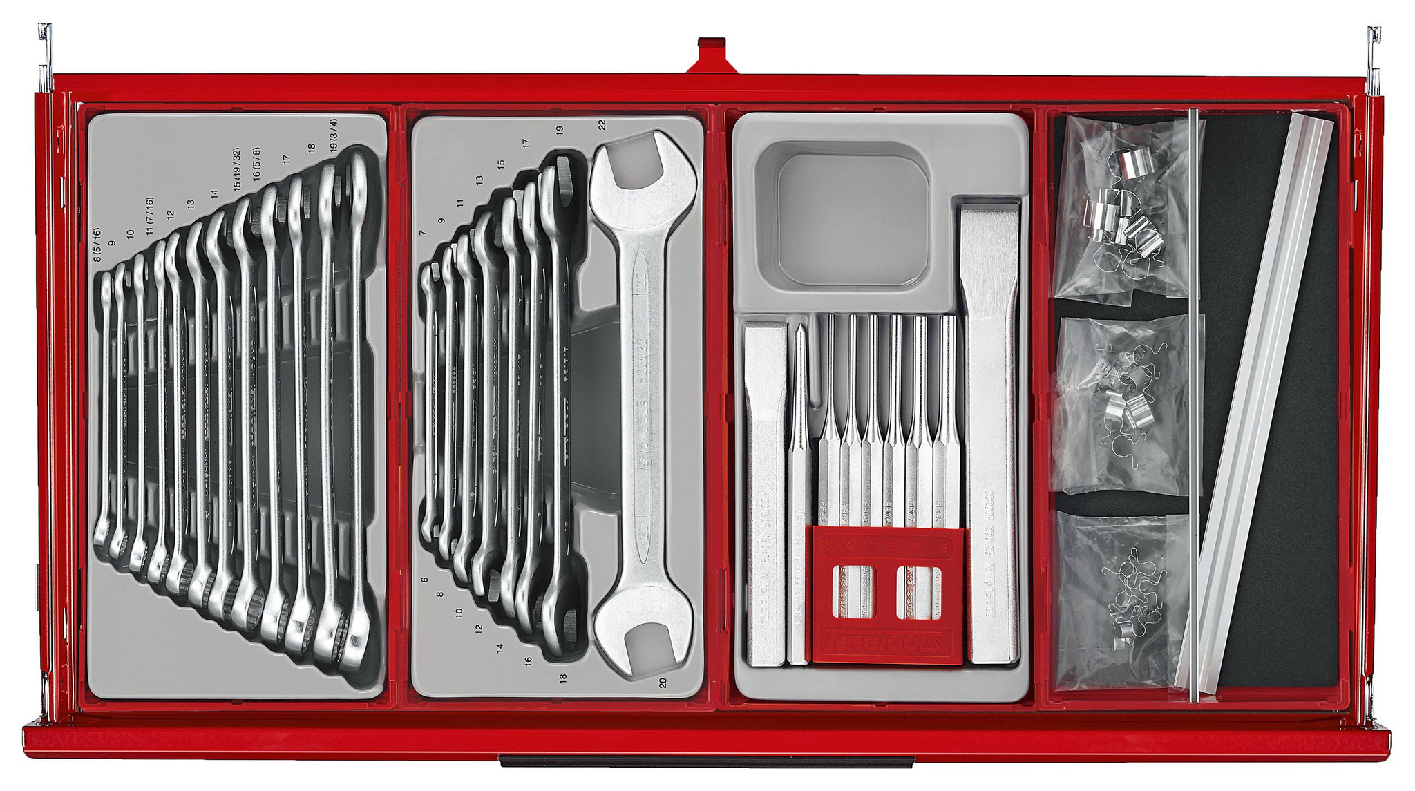 Do bardziej specjalistycznych zastosowań dołączone są łomy, klucze dynamometryczne, gwintowniki, matryce i narzędzia inspekcyjne. Ponadto zestaw narzędzi zawiera klucze i nasadki calowe, a także szereg ogólnych narzędzi, dzięki czemu obejmuje większość codziennych aspektów mechanicznych i przemysłowych potrzeb narzędziowych. W zestawie znajdują się dwa 32-częściowe zestawy szyn zaciskowych, uchwyt na papier i wsporniki mocujące do bezpiecznego przymocowania skrzynki narzędziowej do szafki.