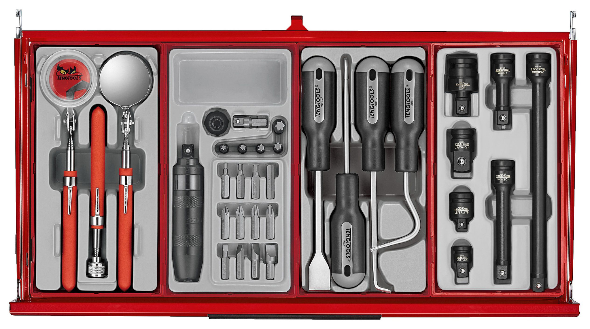 Ten sposób organizacji narzędzi umożliwia dostosowywalną i dynamiczną konfigurację zestawu narzędzi, jednocześnie ułatwiając wykrycie, czy narzędzie zostało zgubione lub zapomniane w projekcie. Zestaw narzędzi zawiera różnorodne nasadki napędowe 1/4, 3/8, 1/2 i 3/4 cala, nasadki bitowe i grzechotki, dostosowane do różnych rozmiarów i typów elementów złącznych. Zestaw jest dodatkowo wzbogacony o narzędzia udarowe, klucze płasko-oczkowe, śrubokręty i asortyment bitów. Klucze imbusowe i trzpieniowe z uchwytem w kształcie litery T, szczypce, uchwyty elektryczne i pilniki zwiększają wszechstronność zestawu.
