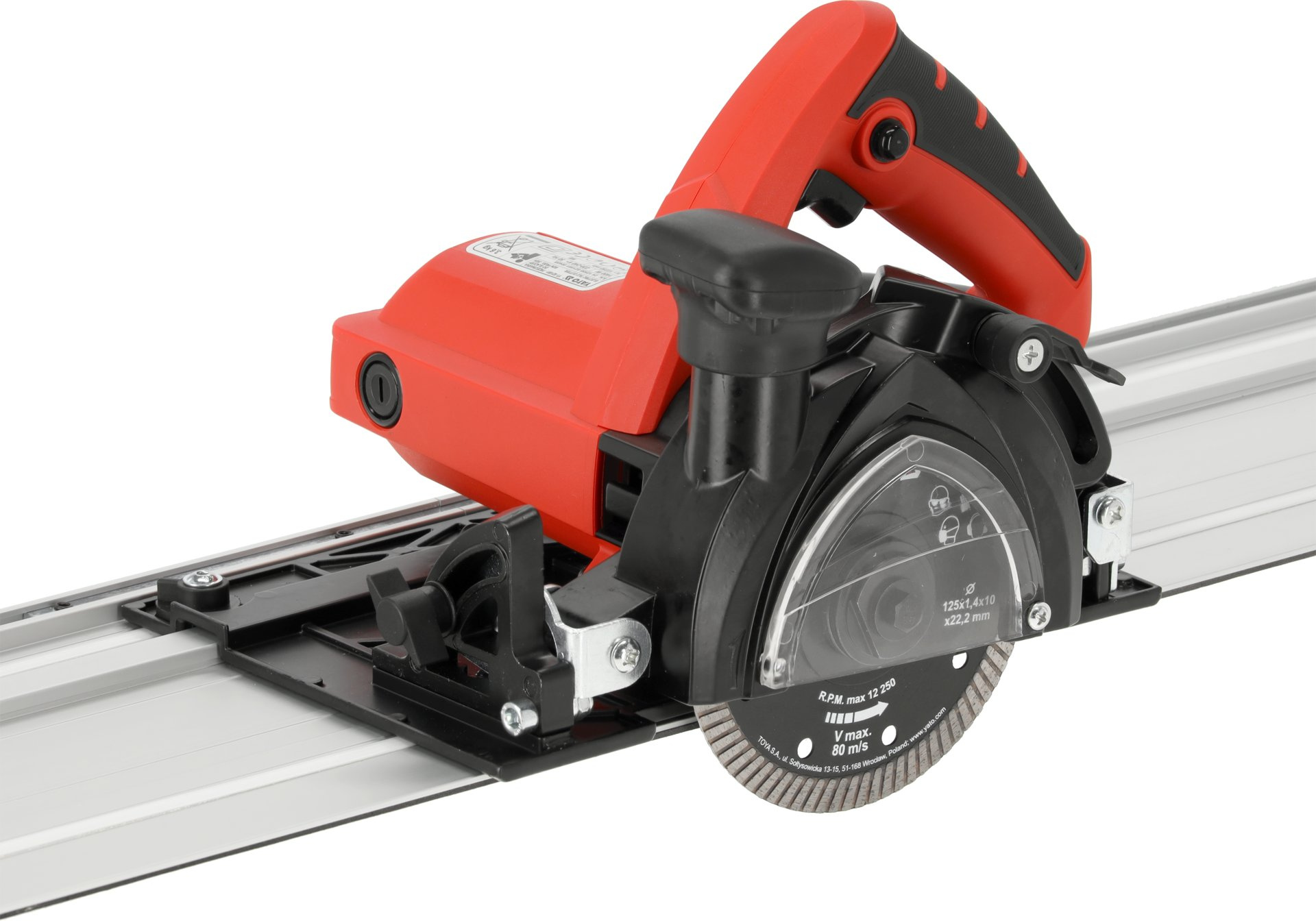 Przecinarka z prowadnicą przeznaczona do cięcia glazury, gresu, kamienia naturalnego, a także fazowania płytek. Umożliwia pracę na sucho i mokro, z regulacją głębokości cięcia.