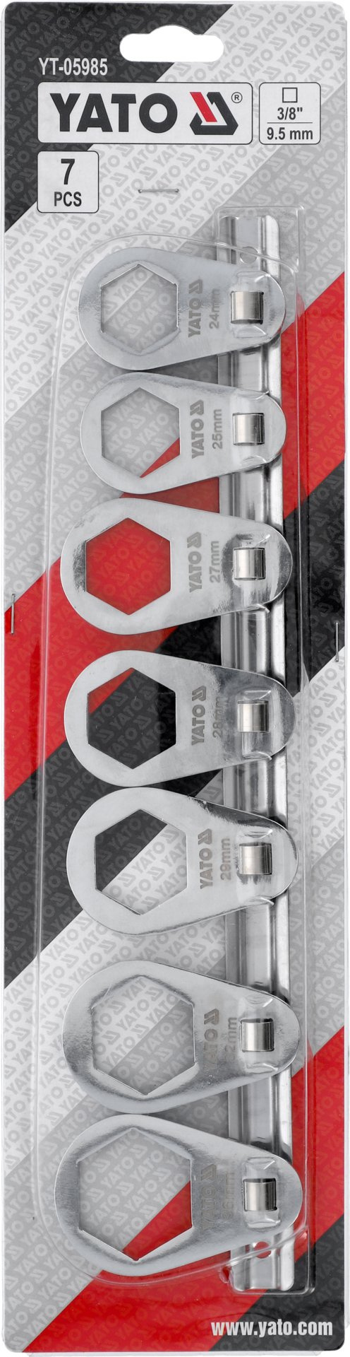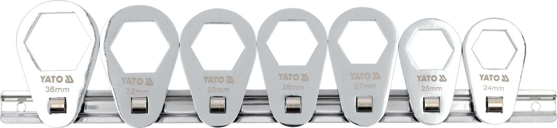 Rozmiary kluczy w zestawie to: 24 mm, 25 mm, 27 mm, 28 mm, 29 mm, 32 mm, 36 mm.