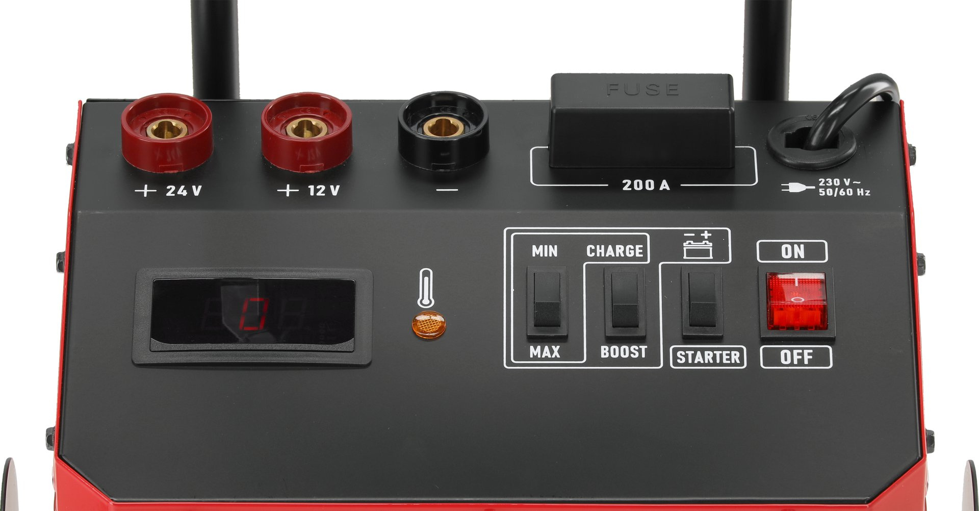 - tryb rozruchu - 12 V/24 V, prąd 320 A (praca przerywana – 3 s włączony, 120 s wyłączony) - funkcja szybkiego wspomagania rozruchu silnika, rozładowanych akumulatorów, skuteczna nawet w niskich temperaturach