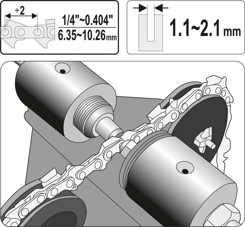 Dzięki zastosowaniu wymiennych końcówek możliwe jest optymalne dopasowanie do łańcuchów o różnej grubości i podziałce.